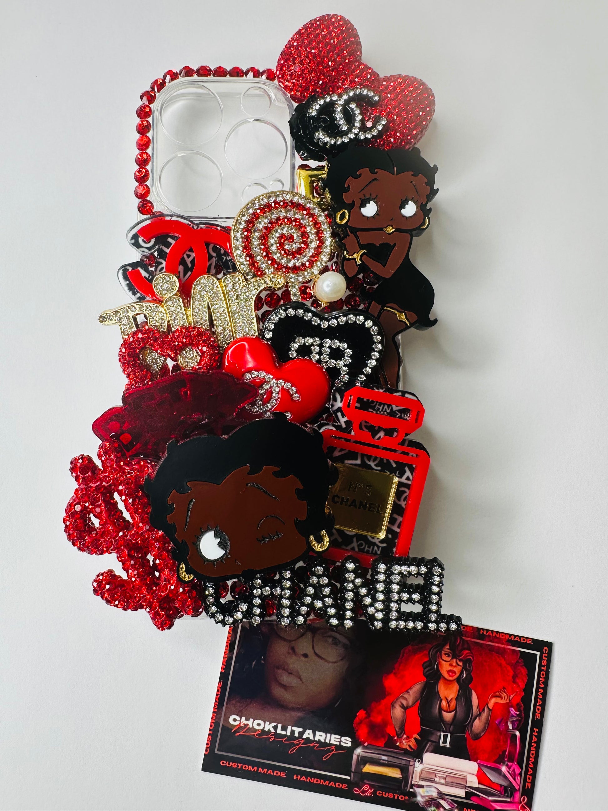 Turn every call into a fashion moment with this ultra-glam, over-the-top junk phone case designed for the bold, the bougie, and the unapologetically extra. Handcrafted with premium epoxy resin, this statement piece features a stunning mix of sparkling red hearts, rhinestone accents, designer-inspired charms, and two adorable Betty-styled melanin beauties giving full attitude.