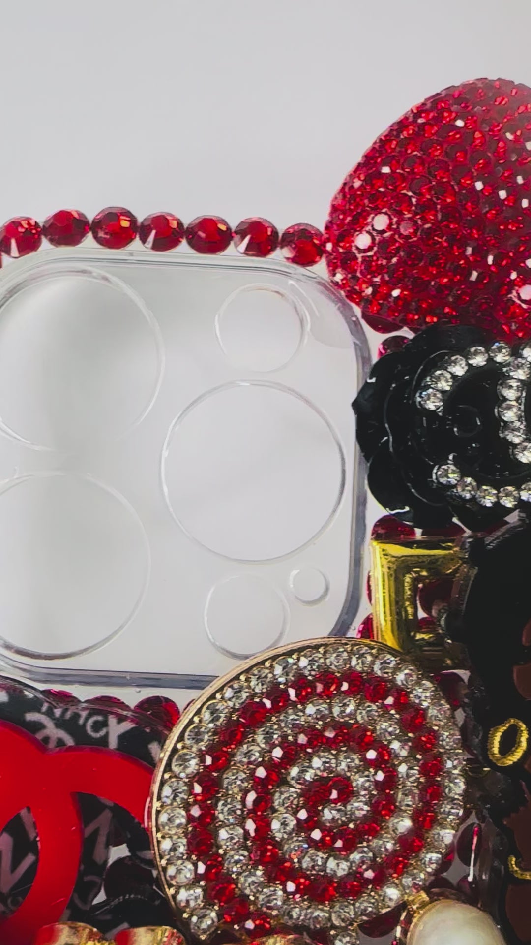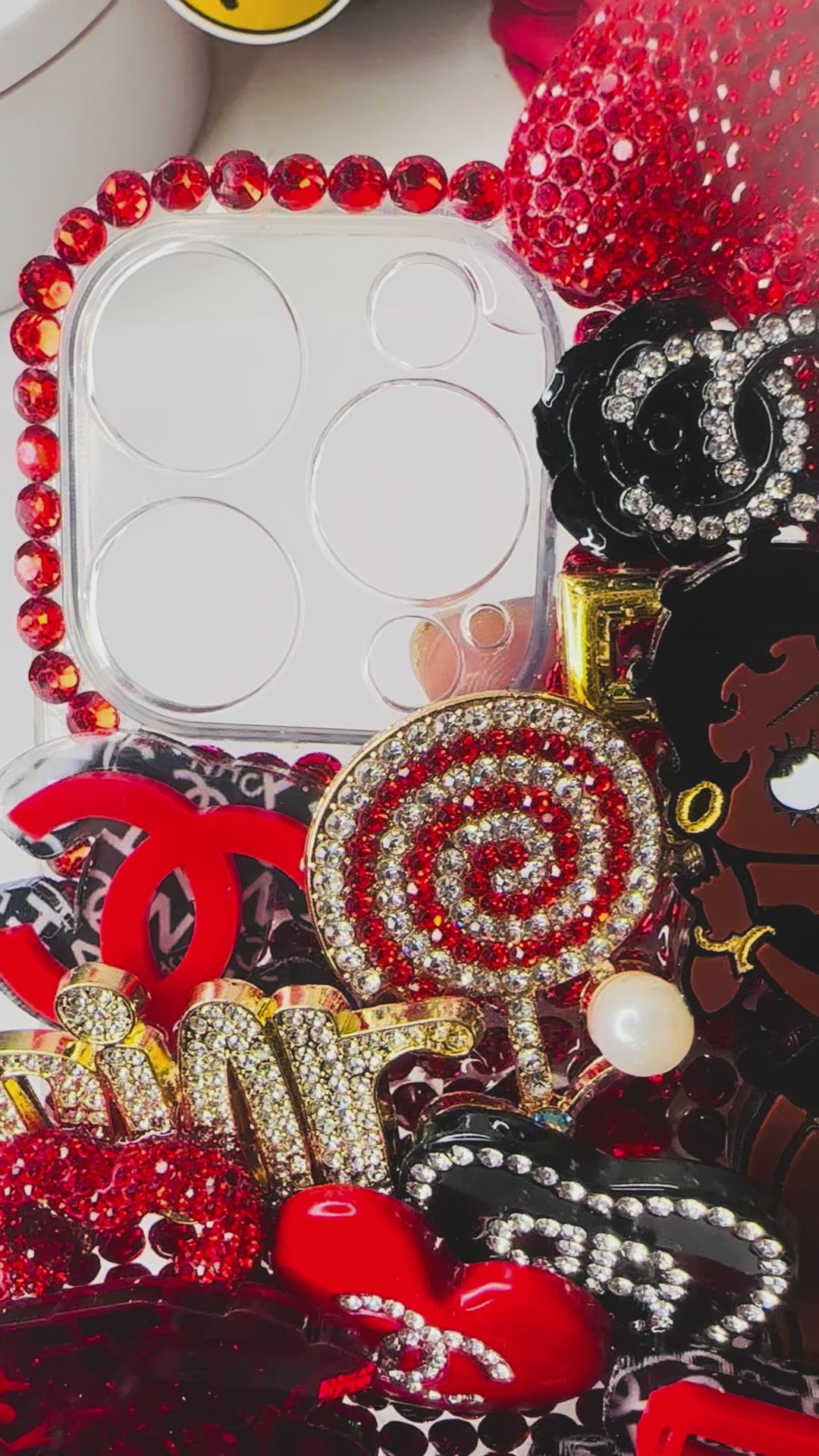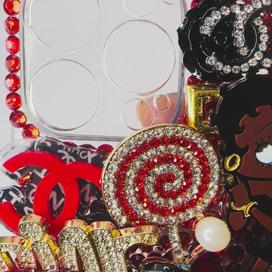 Layered with a swirl lollipop charm, glam pearls, glittered Chanel-inspired elements, and a bold crystal “CHANEL” statement piece, this case is dripping in luxury and personality. The deep reds, pops of gold, and high-shine stones create a rich, feminine, eye-catching look that turns your phone into wearable art.